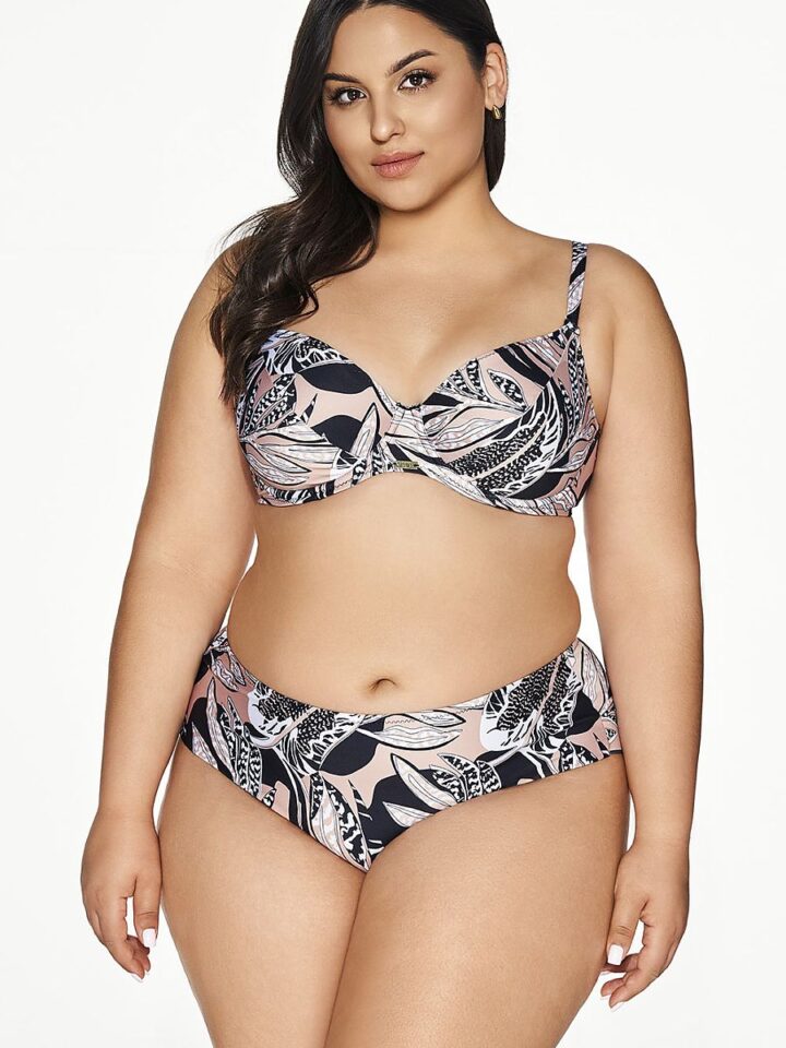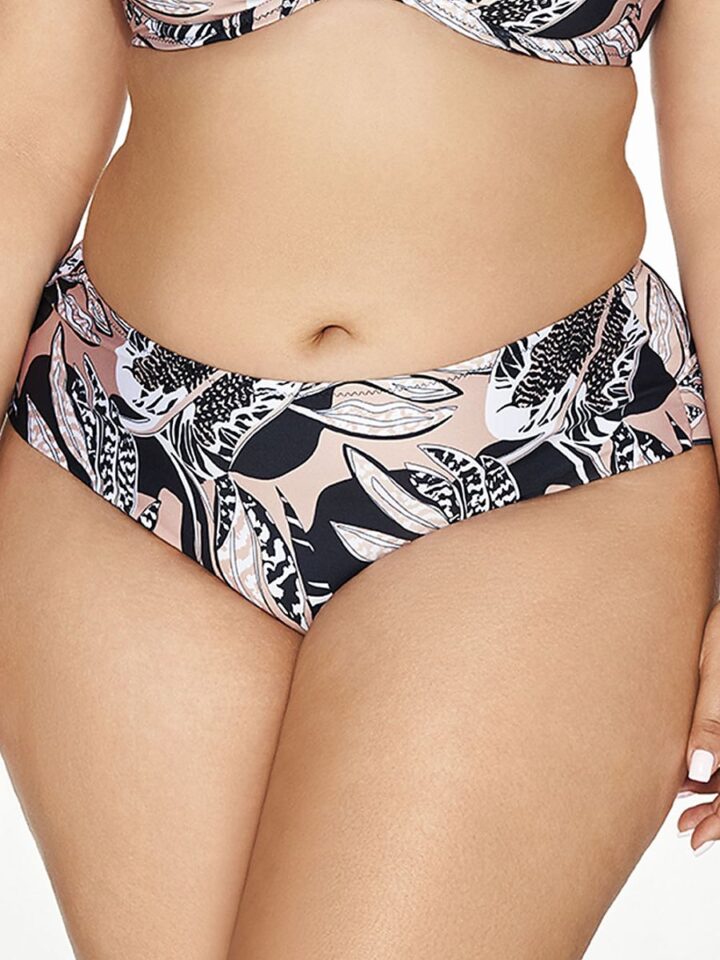 Brazilian style bathing briefs made of microfiber decorated with a plant motif pattern. Wider sides, back cut at the buttocks. Lined with material on the inside.